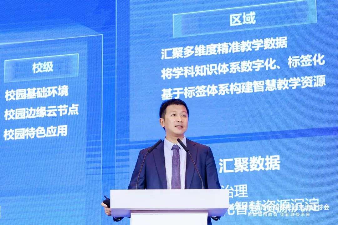华为中国政企教育业务部副总经理李司宇以《夯实智慧教育数字底座,助力现代教育生态重构》为主题发表演讲,分享了华为对区域智慧教育的理解,介绍了作为全国示范的“西安航天基地智慧教育平台”标杆案例。
