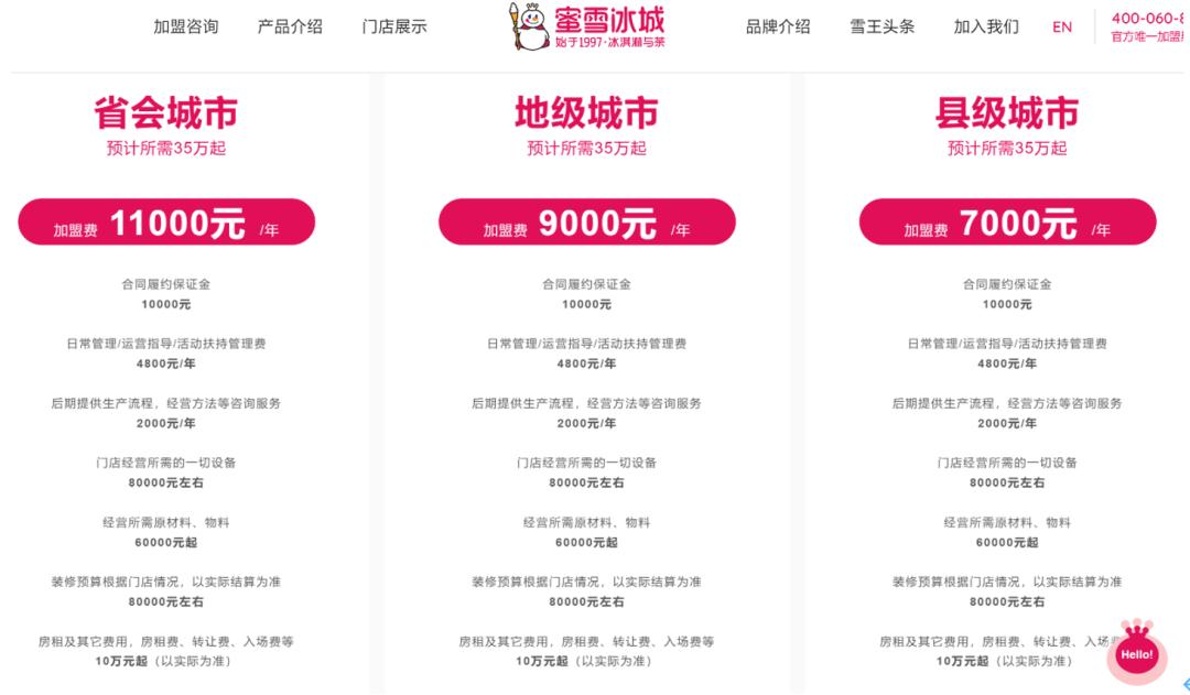 (蜜雪冰城加盟费、开店费 图片来源:蜜雪冰城官网)