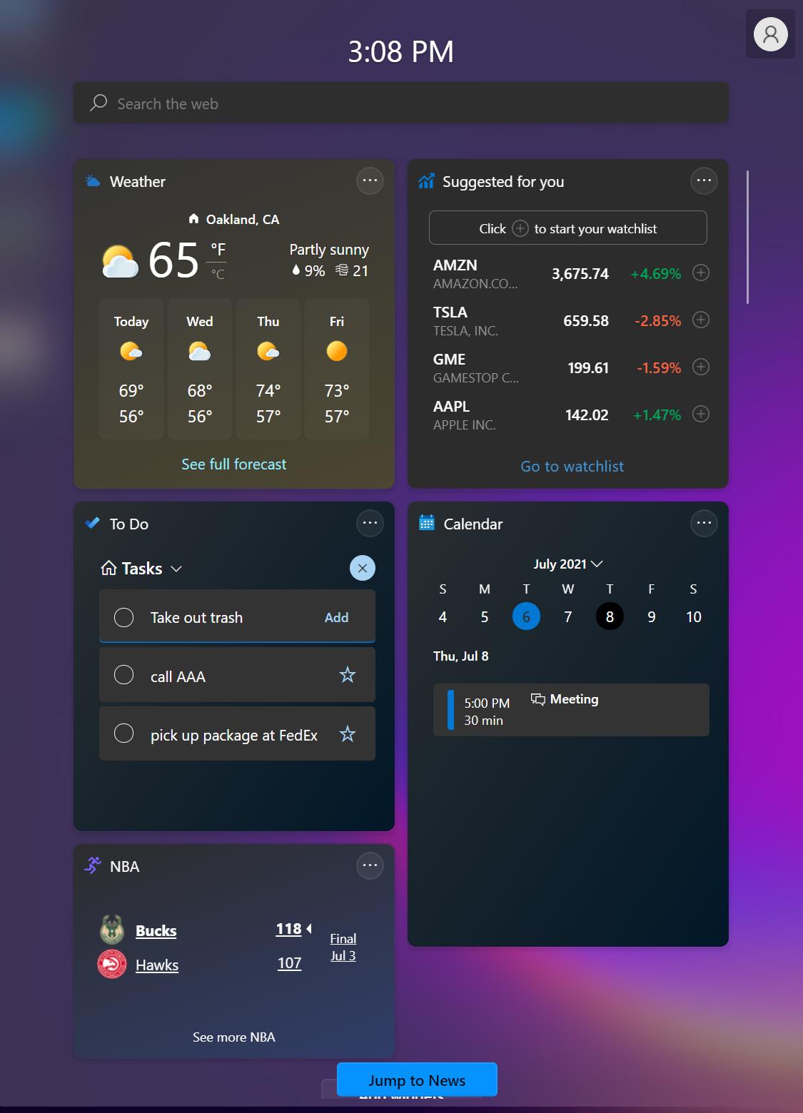 Windows 11 还重新引入了小工具(widget),这是苹果和谷歌操作系统长期以来一直都在用的一个概念。基本上小工具是一个始终保持打开状态的轻量级应用,如天气应用、日历或股票行情什么的,这样你就可以马上浏览重要信息。怎么查看小工具?点击那个抽屉样子的按钮即可,里面装满了所有的小工具。