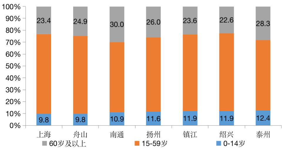 图:长三角地区典型老龄少子化城市各年龄段人口占比(%)