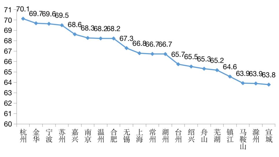 图:长三角地区15-59岁劳动力人口比重TOP20城市(%)