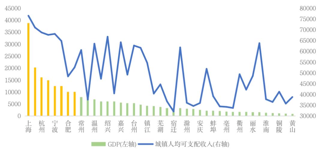 图:2020年长三角41市GDP和城镇居民可支配收入(单位:亿元,元/人*年)