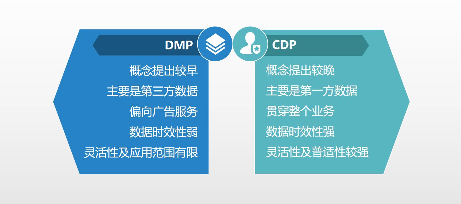 简单理解,DMP更多的是为了广告服务的,所以早期都是随着媒介、广告、代理公司而一并被提出来的,比如阿里早期的达摩盘。而CDP更多的是贯穿整个业务的,围绕着用户建立一个整体的管理体系,再与各个部门进行结合。