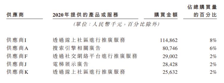 另外,在雍禾医疗的招股书中,其罗列出来的前五大供应商均为广告服务提供商,所提供的广告渠道包括线上社区、搜索引擎、网络社交平台和电梯展示。
