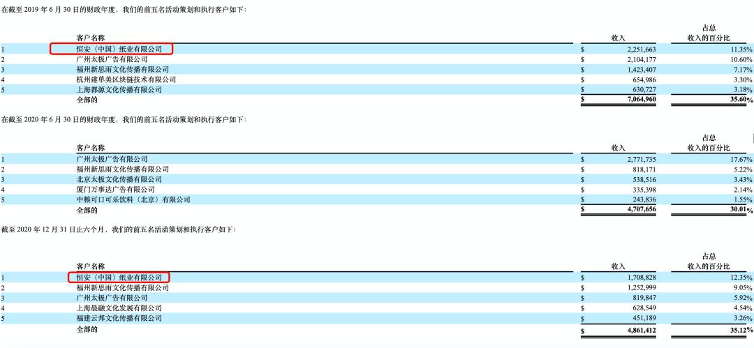虽然这些客户应收占比较高,但并不稳定。典型如恒安(中国)纸业,在2019年6月30日财年和2020年半年报中都位列五大客户之首,营收贡献比例超10%,但在2020年6月30日财年却消失得无影无踪。