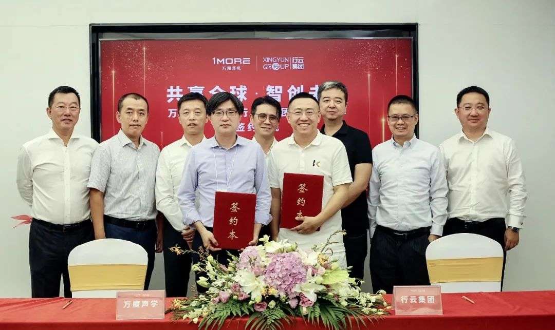 仪式现场,万魔声学董事长谢冠宏与行云集团创始人、董事长王维Billy代表双方共同签署了战略合作协议。万魔声学副总裁林柏青、万魔声学副总裁兼CFO乔超、1MORE品牌COO王强、万魔声学副总裁沈辉、行云集团高级副总裁王砚耕Yankee、行云集团高级副总裁张宇Alex、行云集团副总裁余滨Ben等一行人见证了仪式。