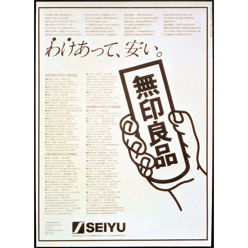 无印良品(MUJI)可能是最擅长无实体设计的公司之一了,崇尚无即是有的它,在海报广告上也保持一贯的简约和无产品、无品牌。1980 年发布的首张海报,简洁风格就已经显露无疑,除了大量文字铺陈,就只有一个手持无印良品小牌图。