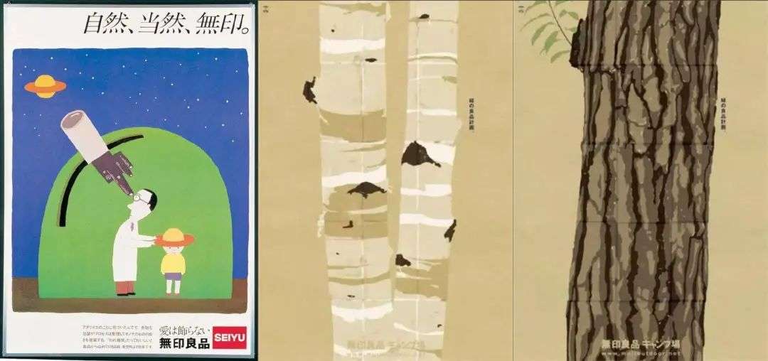 1983 年 MUJI 推出了经典海报「自然、当然、无印」,手绘图中小孩戴上和土星一样的帽子,很好地体现了 MUJI 崇尚自然、强调舒适的风格。此后的广告大多类似,海报大多都是从自然、人物中取材,虽然都没有露出 MUJI 的产品,但却在人们心中建立了产品自然、舒适的概念,推动销量增长。
