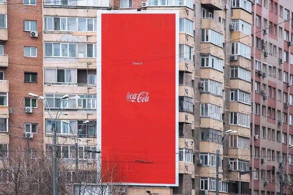 广告用上了大量红色作底,图中仅有一个可口可乐 logo 和小小的一句感受它(Feel it)。看起来似乎违反了直观易理解的基本规则,但仔细观察就会发现图中文字和可口可乐 logo 的排版,和可乐经典玻璃弧形瓶是一样的。