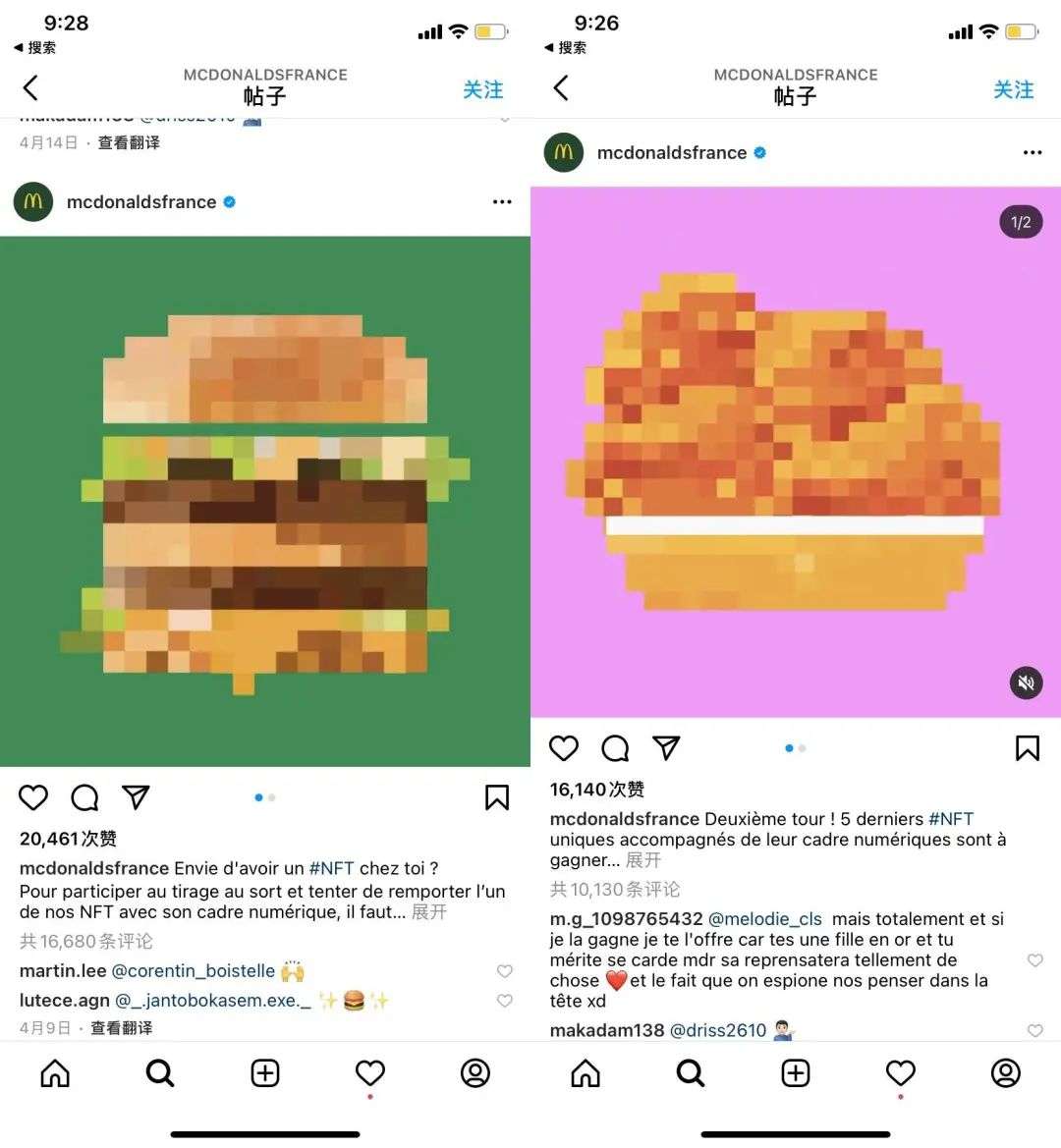 ▲麦当劳在 Instagram 抽送了几个像素 NFT 产品,结果很受欢迎