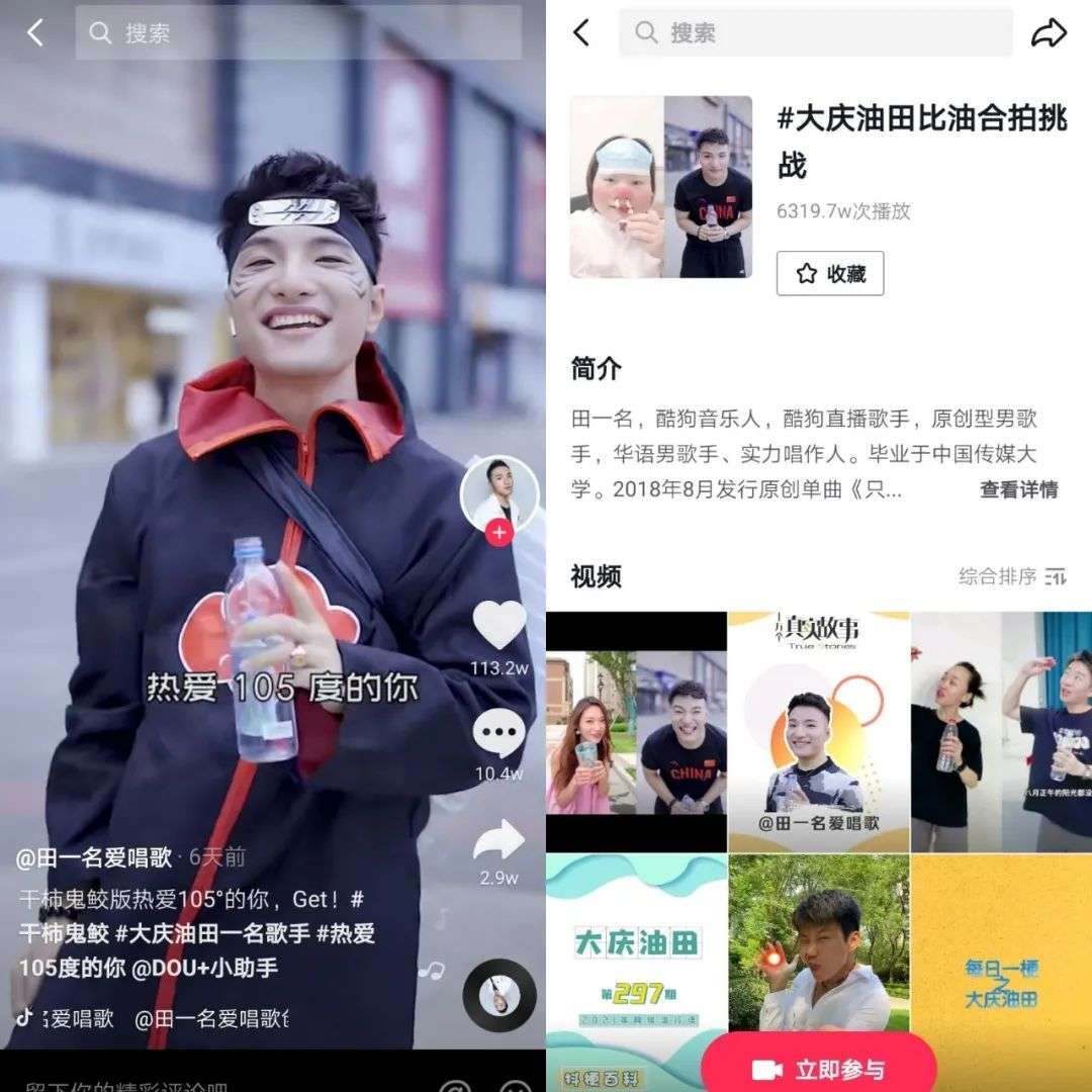 截至目前,抖音#热爱105℃的你话题下已有30.8w支视频,总计获得38.5亿次播放。各路达人的翻唱与二创很好地维持了作品热度,如酷似《火影忍者》中“干柿鬼鲛”的田一名,凭借油腻的唱法被用户冠以“比大庆油田还油”的“油王”称号,“油腻版”105℃引发网友合拍狂欢,相关挑战话题已获得6319.7w的播放。