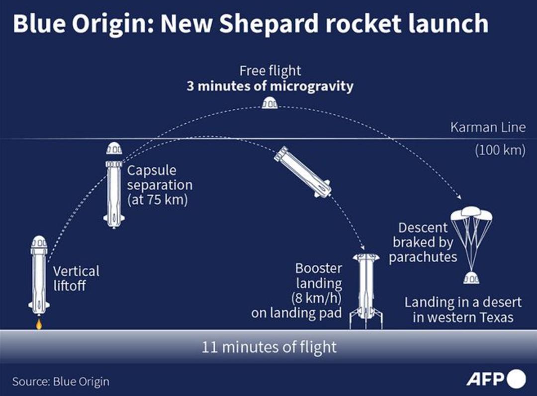 在预热了两个多月后,美东时间7月20日上午9点(北京时间7月20日21点),57岁的贝索斯将乘坐自家蓝色起源公司(Blue Origin)的“新谢泼德号”火箭飞上太空。按照预定的程序,起飞约3分钟后,太空舱将与助推器分离,随即像一颗棒球般做了个抛物线运动越过“卡门线”——这是距离地面100km的太空,也是国际公认的地球大气层与太空分界线,贝索斯一行就此进入外太空,并将体验3分钟的太空失重感。
