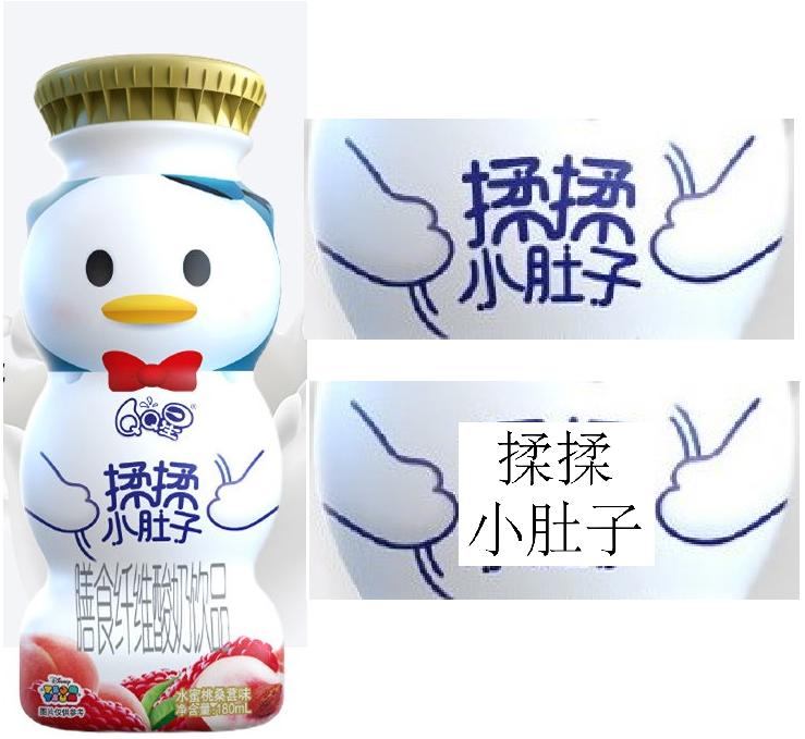 以QQ星揉揉小肚子酸奶这款为例,瓶身整体被设计为小企鹅揉肚子的造型,因而“揉揉小肚子”5个字选用了可爱软糯糯的字体,并且放置角度也和小肚子的造型相符合,让产品体现出肠道通畅、健康简单的舒适感。若将这5个字换成宋体(如图所示),甚至觉得揉肚子越揉越疼!因而,字体的选用和摆放的角度对于产品呈现的美观度有着不可忽视的作用。