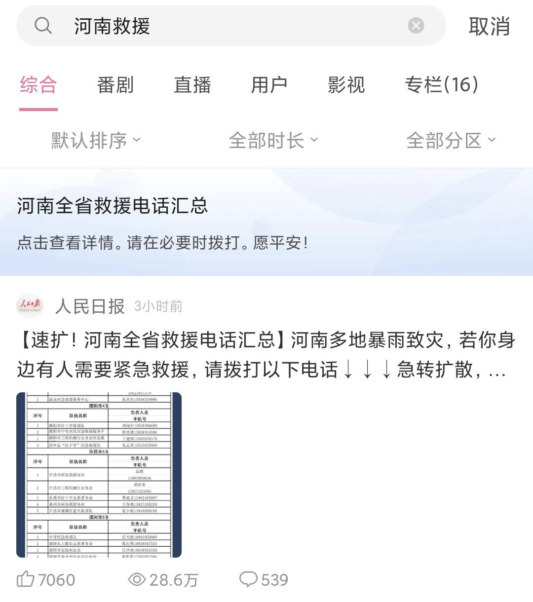 B站也上线了紧急求助卡片,如有需要,可搜索“河南救援”寻找求助电话。