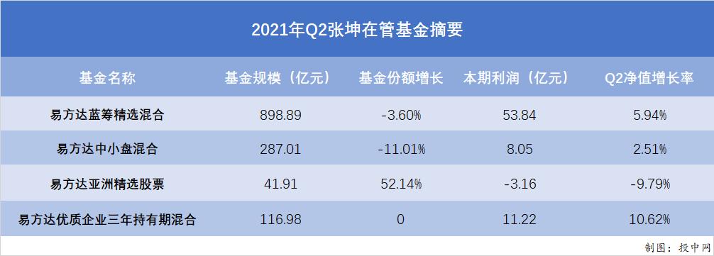 数据显示,截至二季度末,张坤管理的4只基金的规模为1344.78亿元,较上一季度末的1331.09亿元略有增加。其中,蓝筹精选、中小盘混合以及优质企业三年持有期混合二季度扭亏为盈,本期利润分别为53.84亿元、8.05亿元、11.22亿元。