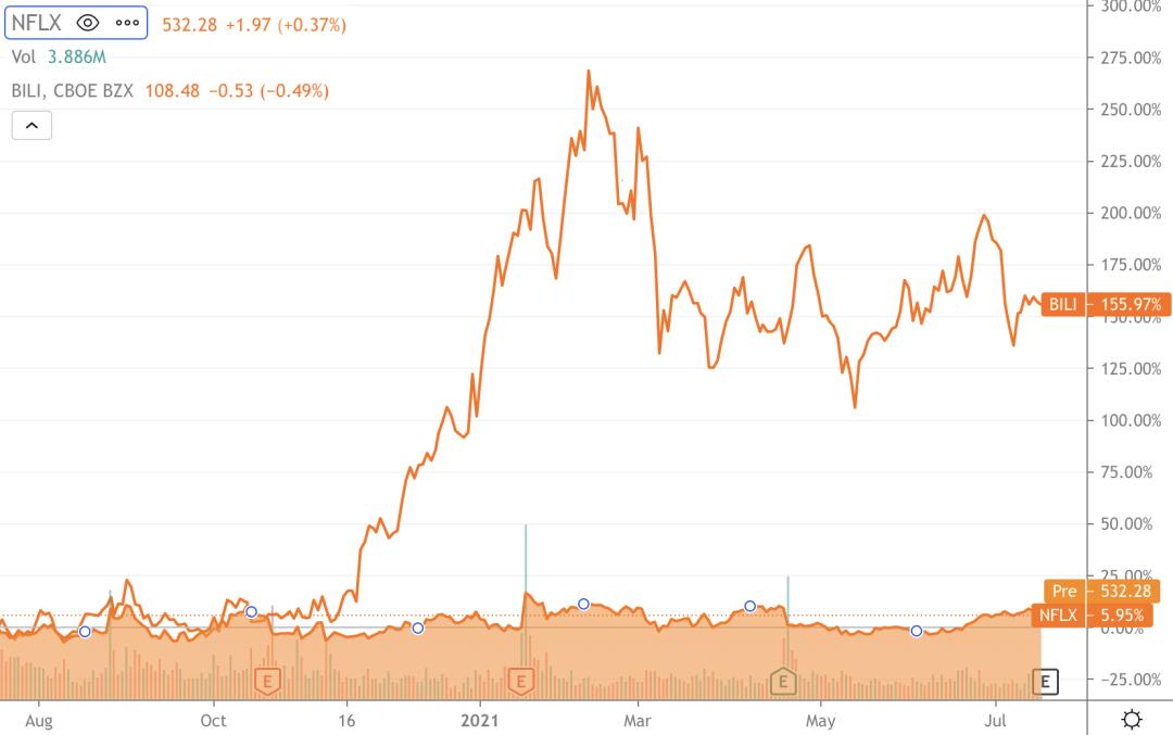 近一年B站与Netflix股价涨幅对比