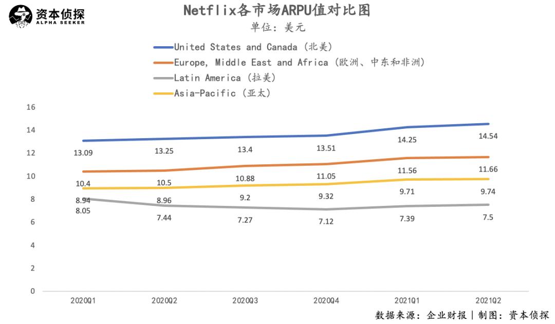 具体来看,根据2021年Q2财报,Netflix北美市场ARPU值为14.54美元,欧洲、中东和非洲市场ARPU值不低,为11.66美元,但同样用户增速已经趋缓;Q2 Netflix新增用户的主要来源为拉美市场及亚太市场,而这两个市场的ARPU值分别仅为7.50美元、9.74美元。