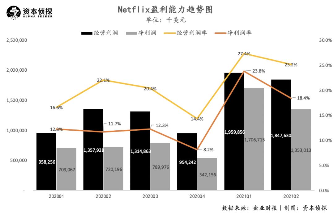 2021年Q2,Netflix实现营收73.4亿美元,同比增长19.4%;实现经营利润18.5亿美元,同比增长36.1%,经营利润率从去年同期的22.1%提升至25.2%;