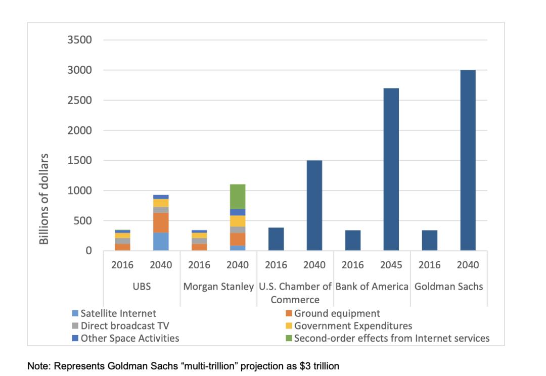 据UBS、摩根士丹利、高盛等机构的预计,太空经济规模在2040年可能高达3万亿美元。