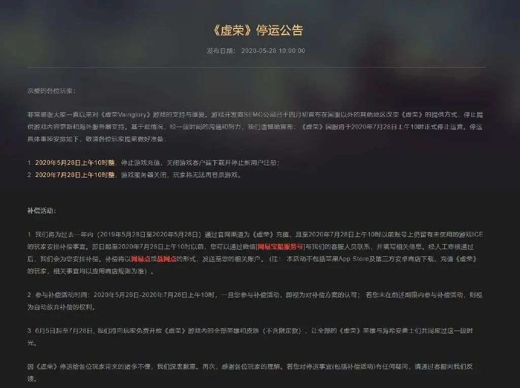 外服停运一个多月后,《虚荣》国服也宣布关闭
