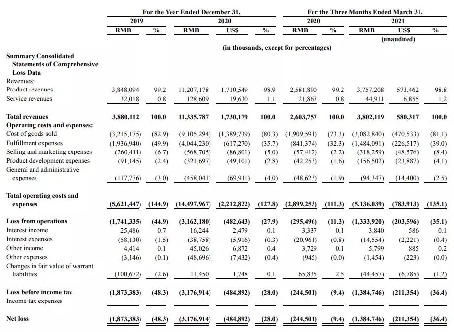 叮咚买菜的招股书显示,2019年、2020年、2121年Q1叮咚买菜总营收分别为人民币38.8亿元、人民币113.36亿元、人民币38.02亿元;净亏损分别达到了人民币18.73亿元和⼈⺠币 31.77亿元、人民币13.85亿元;GMV为人民币47.097亿元、人民币130.322亿元、人民币43.035亿元。