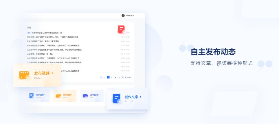 3、 企业可自主发布文章、视频等资讯,快速、多样态传递公司动态。