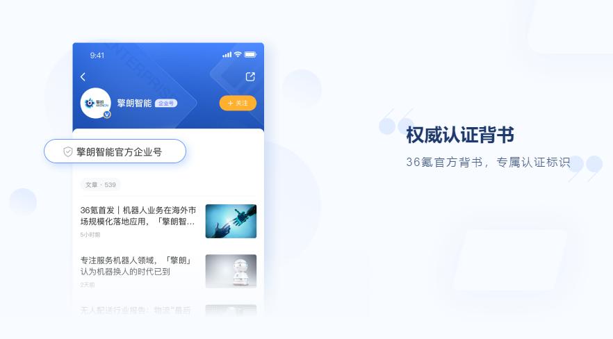 2、 入驻企业经过36氪认证,拥有官方背书、专属认证标识,有效树立品牌权威性。
