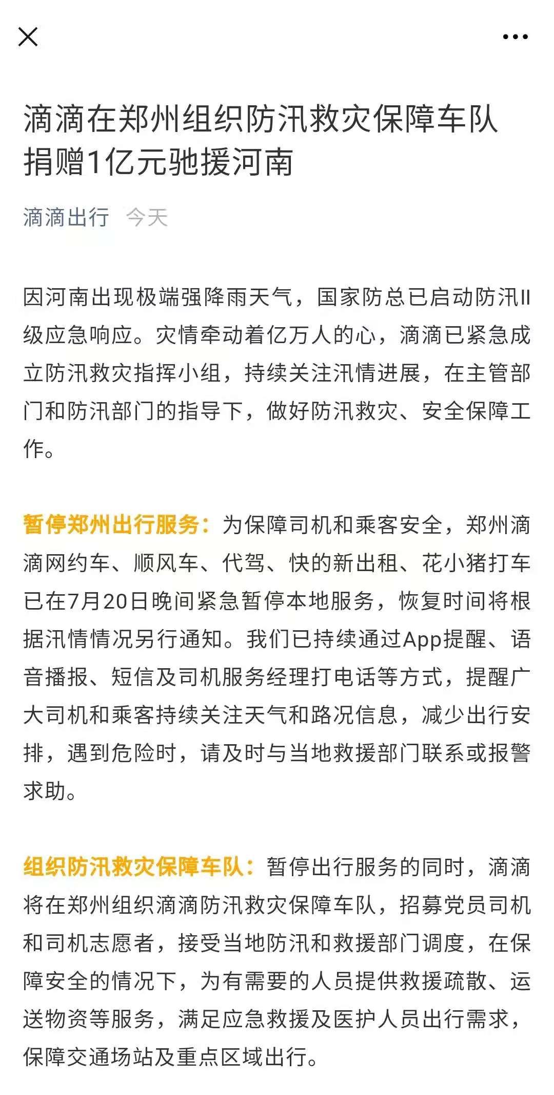 滴滴将在郑州组织滴滴防汛救灾保障车队,招募党员司机和司机志愿者,接受当地防汛和救援部门调度,在保障安全的情况下,为有需要的人员提供救援疏散、运送物资等服务,满足应急救援及医护人员出行需求,保障交通场站及重点区域出行。