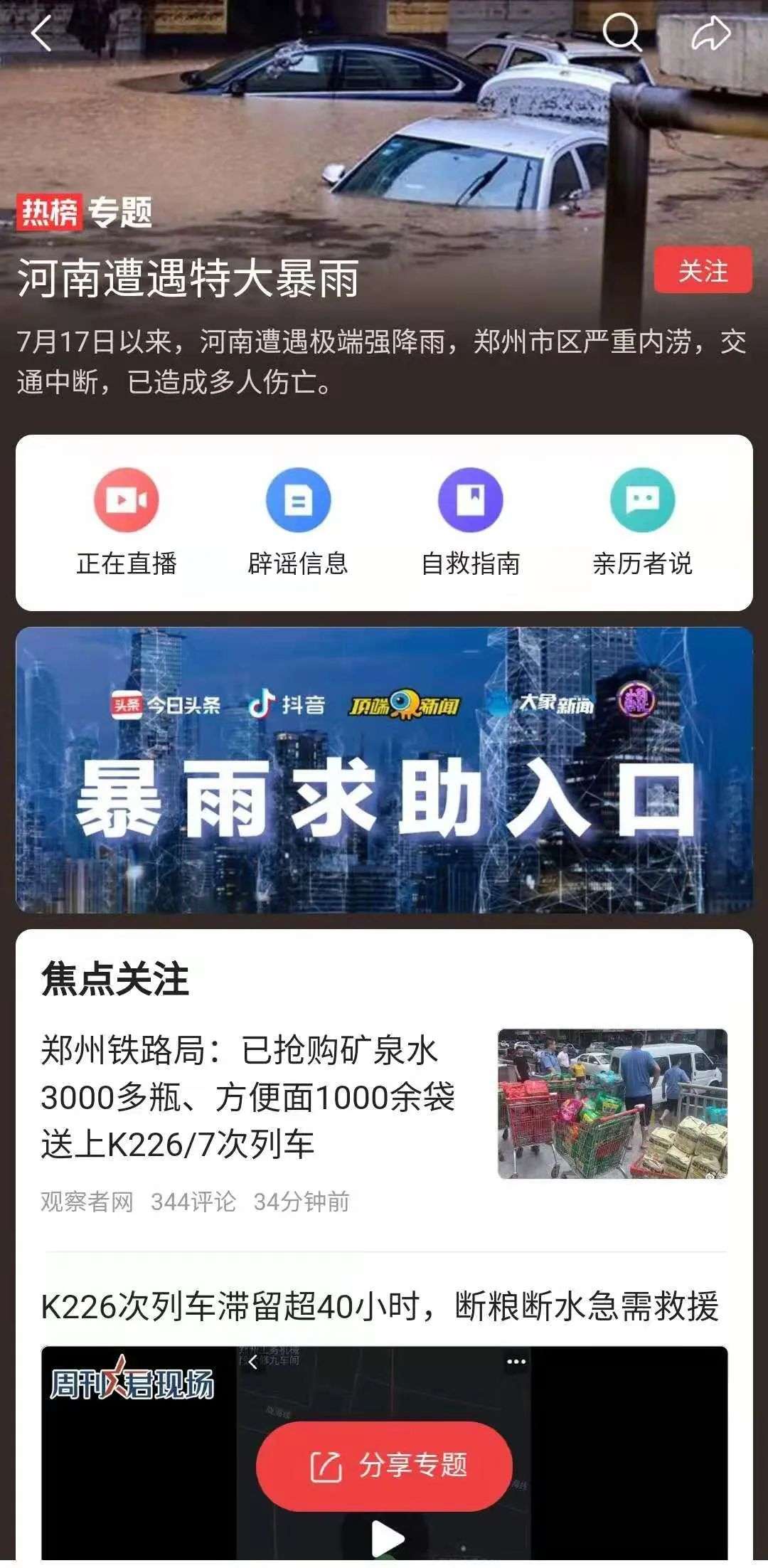 同时多家移动内容分发平台,还纷纷上线【河南暴雨】专题以及直播,第一时间发布汛情相关消息,并公布自救方式和救援电话等信息。