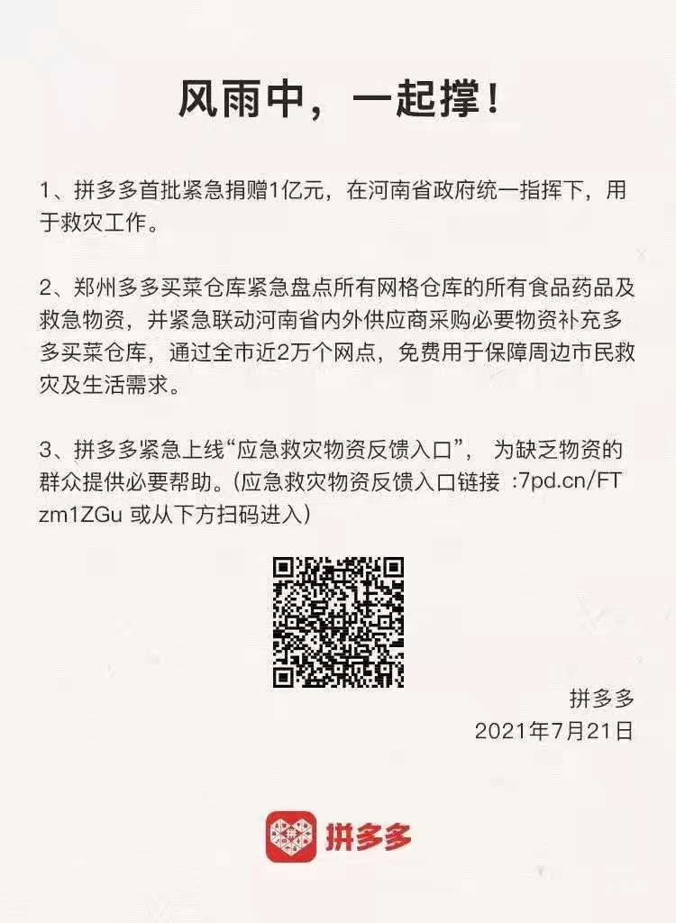 同时,拼多多技术团队第一时间开发上线“应急救灾物资反馈入口”,收集受灾地区抗灾需求,提供信息对接和物资支持。受灾群众及相关社会机构均可通过此入口反馈相关信息,协助受灾群众共同抗灾。