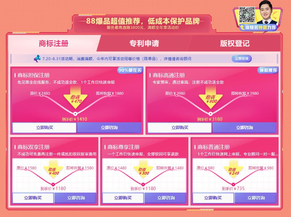这一次的“知识产权狂欢节”活动,对于有批量知识产权服务需求的老板来说,尤其值得关注,就拿商标担保注册这项服务来说,老板们在8月6日购买该项服务达到一定数量后,即可享受底价折上折福利!如:商标担保注册满66件,每件仅需1200元;商标担保注册满88件,每件仅需1100元!