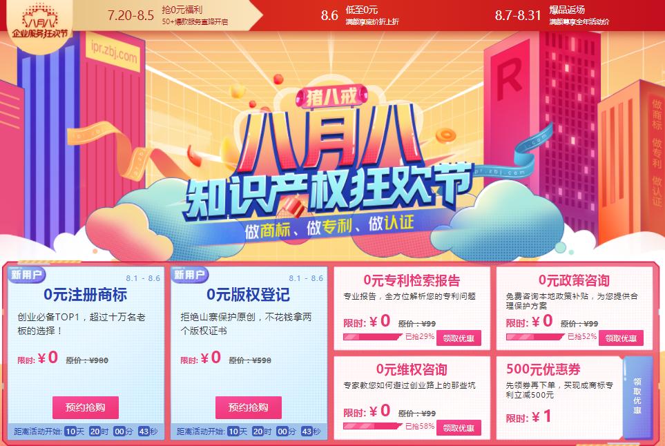 八戒知识产权也于7月20日在官网上线了“猪八戒八月八 知识产权狂欢节”系列主题活动(以下简称:知识产权狂欢节),为企业精心打造覆盖全生命周期的知识产权服务,更有商标、版权限时0元抢、爆款服务最高直降3800元 、1元秒500元交易优惠券等精选特惠,让老板们一站式购齐自己所需要的知识产权服务,省钱、省心,又省力。