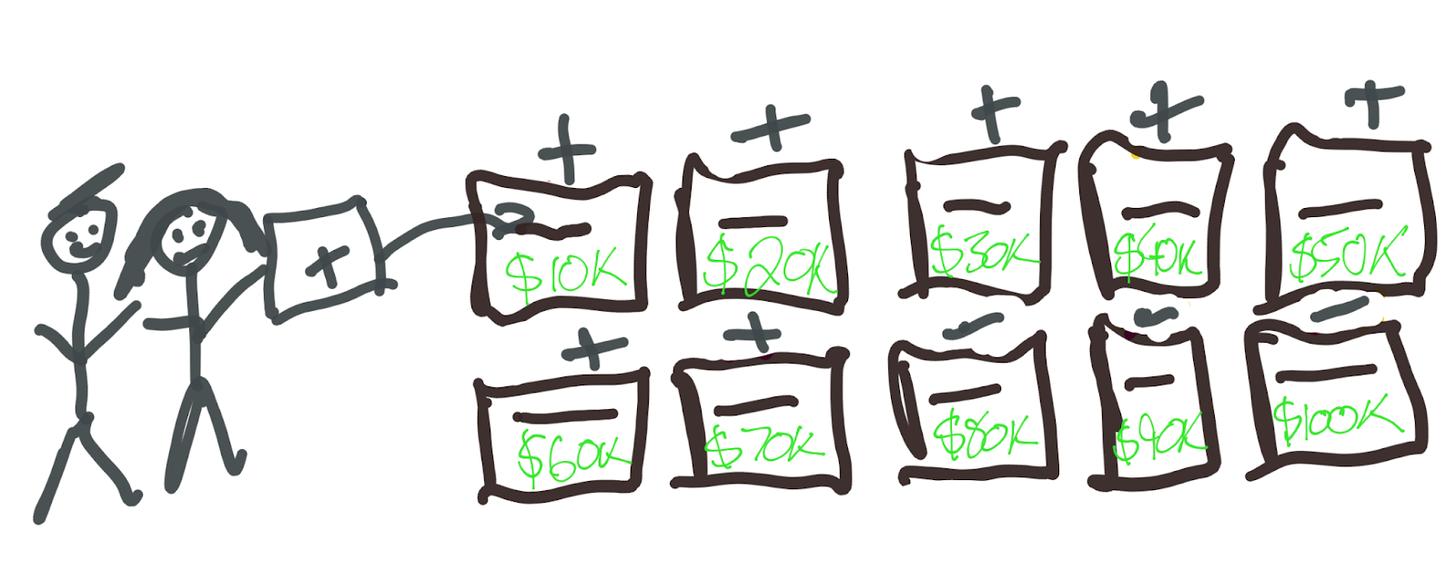 然后我跟Pujia拿着十张纸进去。我们根据每个盒子上的收入是低于还是高于我们的收入,分别在纸上标记“+”或“-”。假设我们能挣75000 美元,我们就把标记“+”的纸条分别塞进前7 个盒子,把“-”的纸条塞进后三个盒子。