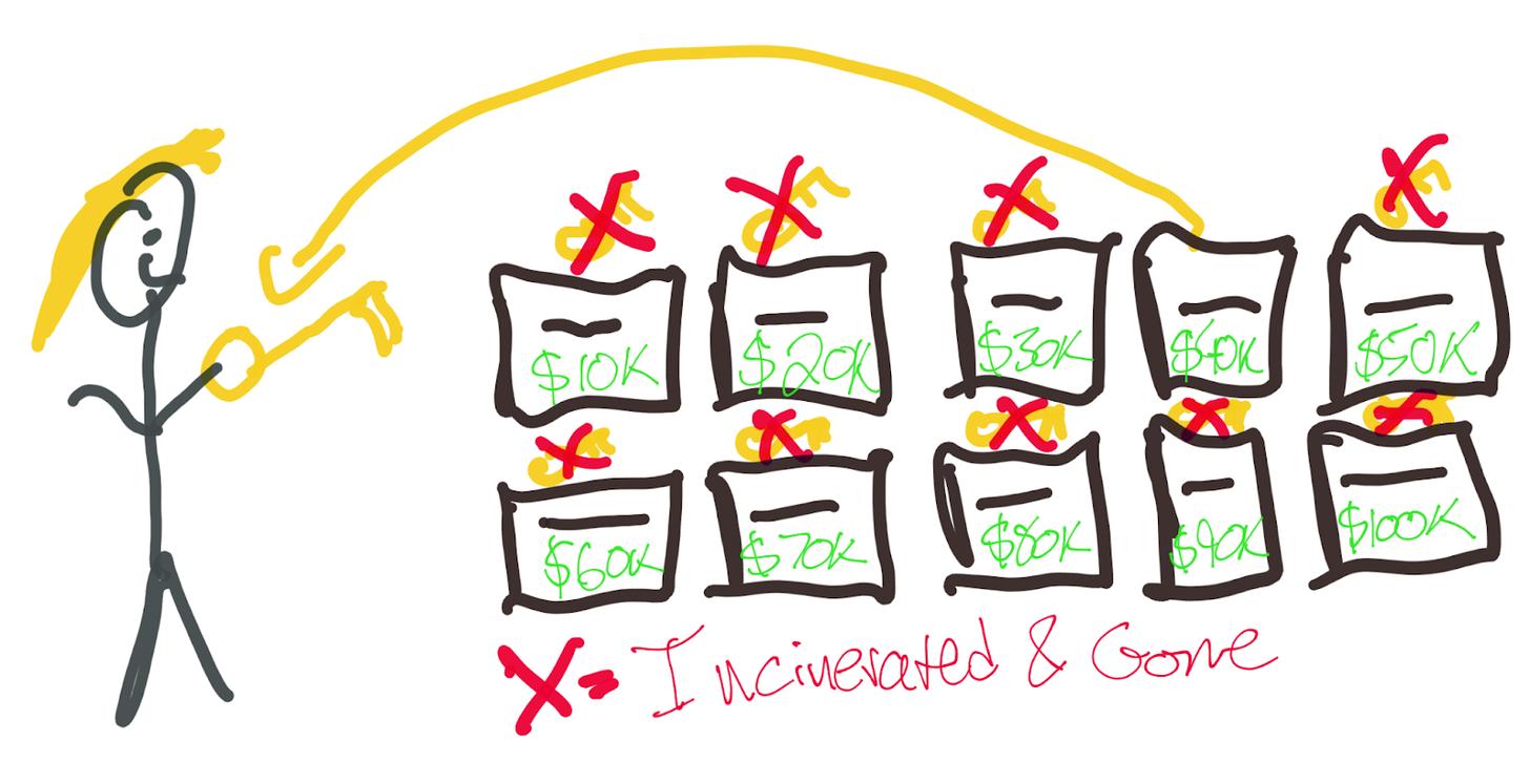 有10个盒子,每个盒子都会打上1万美元到10万美元不等的不同标记(增量为1万美元)。每个盒子都有一把钥匙以及一张纸宽的插槽。Dolores先带着盒子进去,销毁了其中的9把钥匙,然后拿了那把标记 4 万美元的盒子的钥匙。