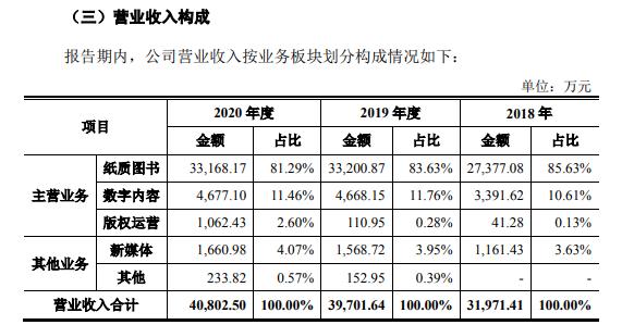 根据招股书,2018年至2020年,读客文化营业收入分别为3.19亿元、3.97亿元和4.08亿元,而近三年公司纸质图书销售金额分别为2.74亿元、3.32亿元和3.32亿元,营收占比分别为85.63%、83.63%和81.29%。