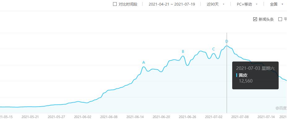 百度指数显示,进入6月以来,黄皮搜索指数呈拉升趋势,在7月3日达到高峰,搜索指数为12560,远超之前6倍不止。