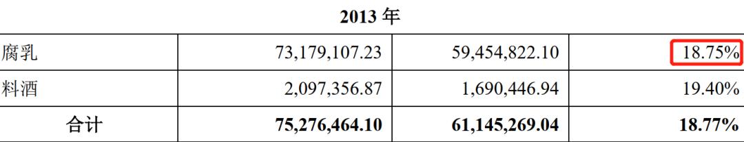 2014年,阿明的腐乳工厂在新三板申请上市,从股份转让说明书可以看到2013年工厂营收达到7579万元,净利润518万元, 其营收占比中腐乳为96%。