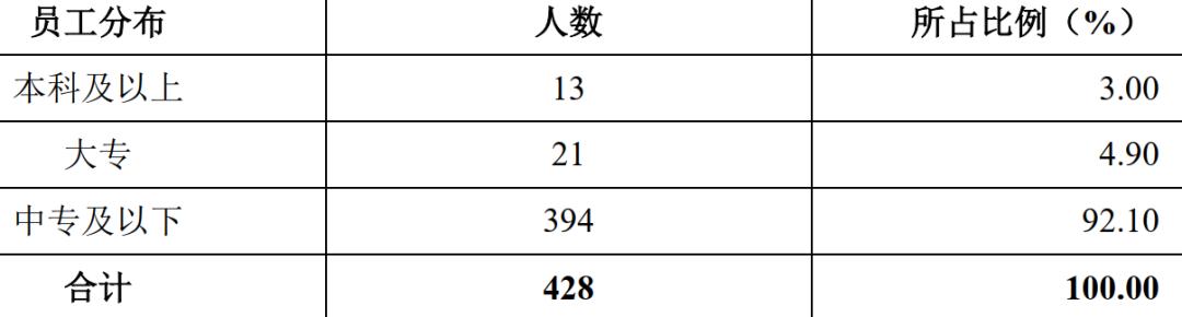 工厂共有428名员工,教育层次中专及以下的占了92%。