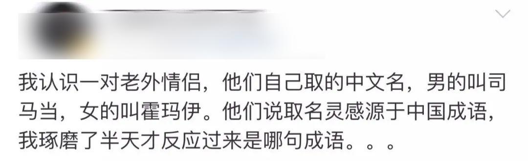 一对外国情侣,男生叫司马当,女生叫霍玛伊,乍一看好像终于有外国人起了个正常的中文名,可拼起来才发现人家的CP是“死马当活马医“。
