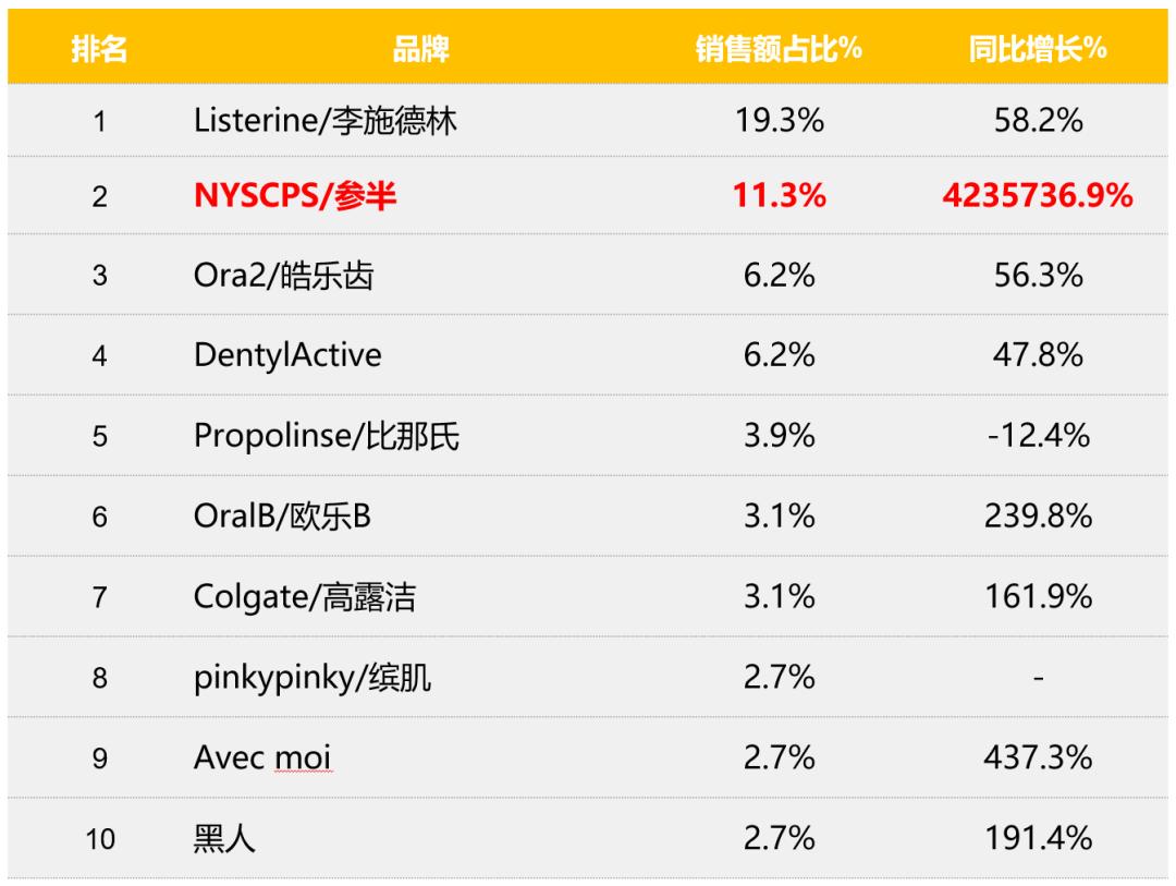 参半 NYSCPS 是尹阔的连续创业项目,品牌创立于 2018 年,主营生产研发个人护理产品,如口腔喷雾、漱口水、牙齿霜等,去年开始主攻漱口水。漱口水这个细分品类的头部品牌是美国品牌李施德林,但其产品可能因含酒精刺激性强、口味不够讨喜而流失一部分用户。而国货品牌们则在口味、包装、添加成分上更符合中国消费者的习惯和心理。