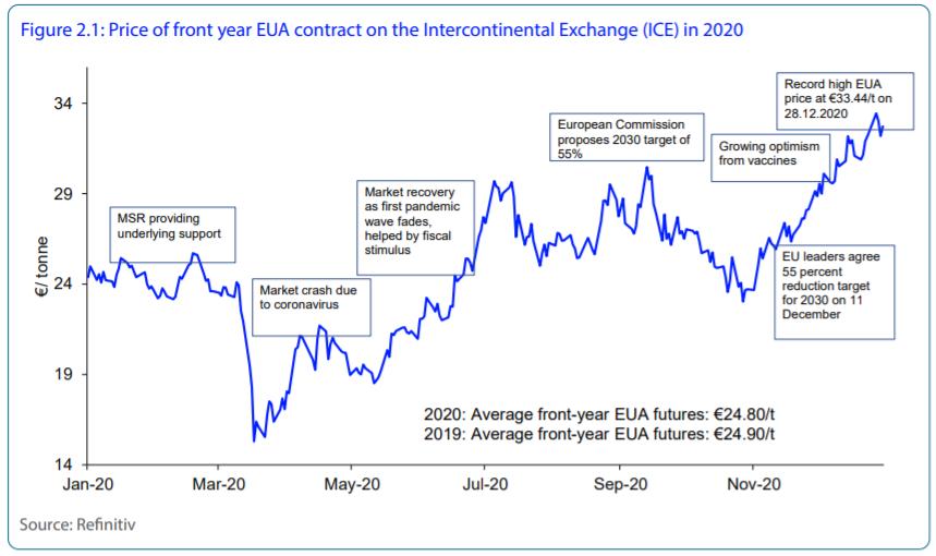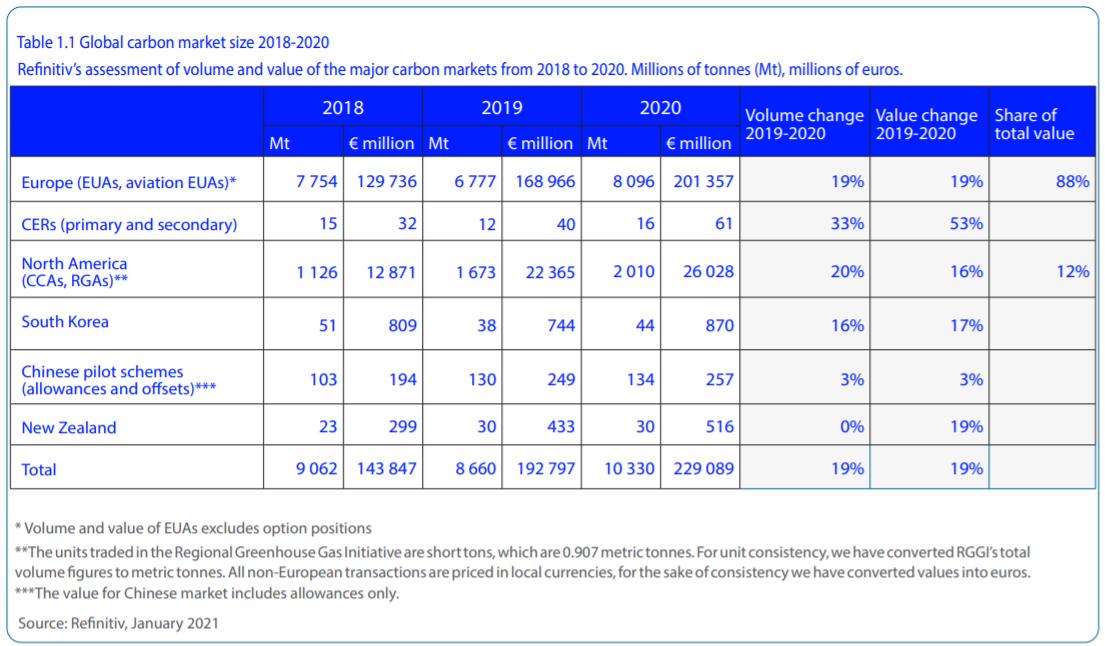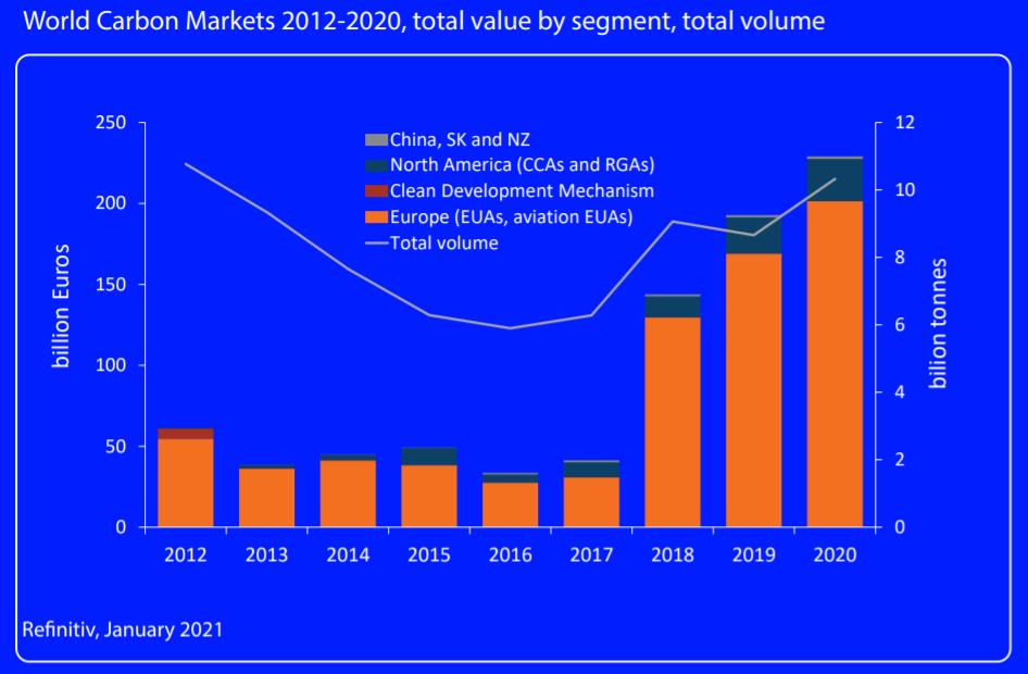根据Refinitiv发布的2020年碳交易回顾报告显示,2020年全球碳交易市场增长了近20%,达到2290亿欧元。这标志着2020年已经是全球碳交易市场连续第四年创纪录的增长,同时2020年碳市场已经超过2017年的五倍。
