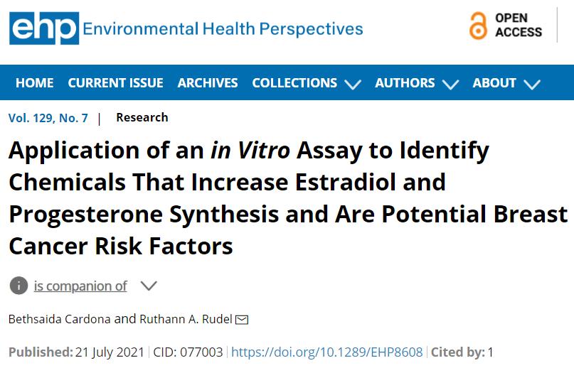 该研究以 “Application of an in Vitro Assay to Identify Chemicals That Increase Estradiol and Progesterone Synthesis and Are Potential Breast Cancer Risk Factors” 为题发表在最新一期的 Environmental Health perspectives 杂志上。