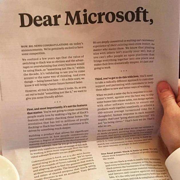 那是在2016年,彼时微软仿照Slack做出的产品Teams刚刚发布,而布特菲尔德立即买下纽约时报的整版广告,发表了一封公开信,在信中“教育”微软该如何做产品——例如必须做一个开放平台、必须用“爱”去工作等等。在这篇公开信发表后,Slack的用户呈现了破纪录的增长,并且持续了不短的时间。