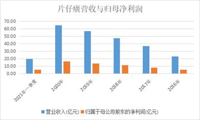 片仔癀虽然涨势疯狂,却也仍有一定的业绩支撑。从2016年至2020年,片仔癀的营业收入与归母净利润一直在逐年上升,虽然营收同比增速有所放缓。今年一季度,片仔癀实现营收20.02亿元,同比增长16.76%,归母净利润5.65亿元,同比增长20.84%。