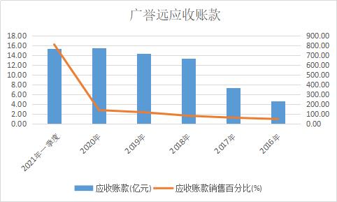与此同时,广誉远的应收账款也在逐年攀升。2016年,广誉远的应收账款为4.63亿元,到2020年就变成了15.6亿元,翻了一倍多。而仅今年第一季度,广誉远的应收账款就高达15.43亿元,几乎与去年全年的应收账款持平。