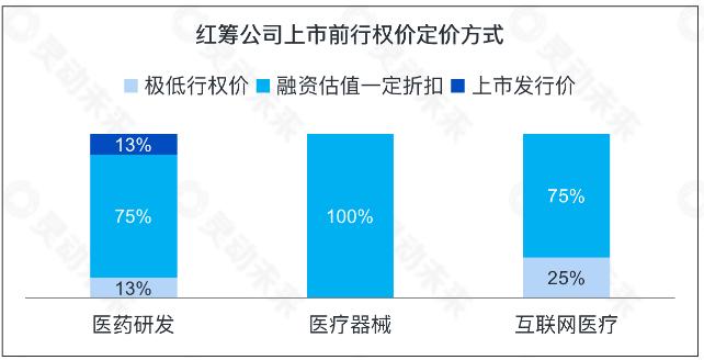 与TMT行业不同的是,医疗健康行业红筹公司较少有使用极低行权价的情况,绝大部分的定价方式是在授予时最新融资估值基础上打一定折扣。医疗健康类仍在发展期,特别是医药研发和医疗器械公司,其在上市时市值一般不超过20亿美元,上市后仍有较大增长空间,因此上市前,业务成熟度相对较低的节点,以一个常规的期权定价仍可享受未来公司市值的高增长的红利。