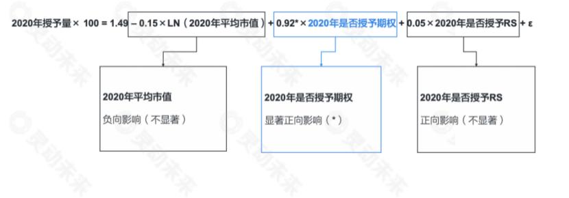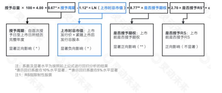 根据回归分析结果,上市后的年度授予量主要跟当年度是否授予期权相关,而与当年度市值关联不大,若授予期权,当年度需要消耗更多的激励资源。原因在于上市后公司为了有效控制股权激励成本,通常从激励价值的角度确定每年度可能消耗的授予量,而激励价值水平相当的情况下,由于期权存在行权价,若选择授予期权,其消耗的股数会更多。