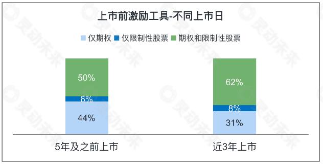 比较特殊的,VC发起的医药研发公司在上市前都有同时授予期权和限制性股票,主要由于这类公司为了引入职业经理人身份的「创始团队」,限制性股票一般会作为给到创始团队的「原始股」,但会在其持有股份基础上加一定时间条件或业绩条件,实现对核心管理层的强绑定,因此这类公司在上市前通常会在构建创始团队时用到限制性股票,但给到其他员工的,主要还是以期权为主。