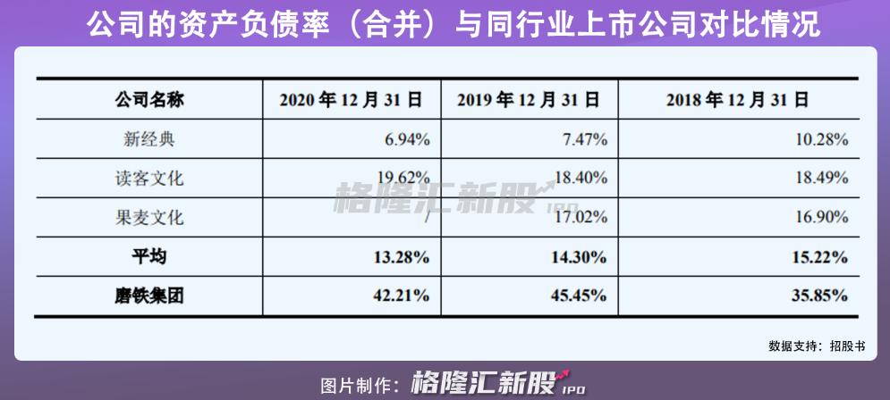 而如果只是待在自己设下的舒适圈也没有太大的成长性和挑战性,红利空间终究还是有遭遇瓶颈的一天。磨铁集团需要通过深耕IP产业链拥有更多的“造血”能力,目前磨铁集团的资产负债率分别为 35.85%、45.45%、42.21%,远高于同行可比公司的平均值。