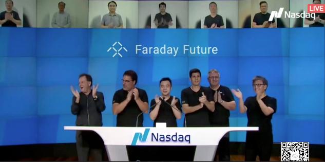 随后毕福康开车,载着贾跃亭前往敲钟现场。在敲钟环节上,贾跃亭并未露面,最终是由FF 6位外部合伙人完成了敲钟仪式。